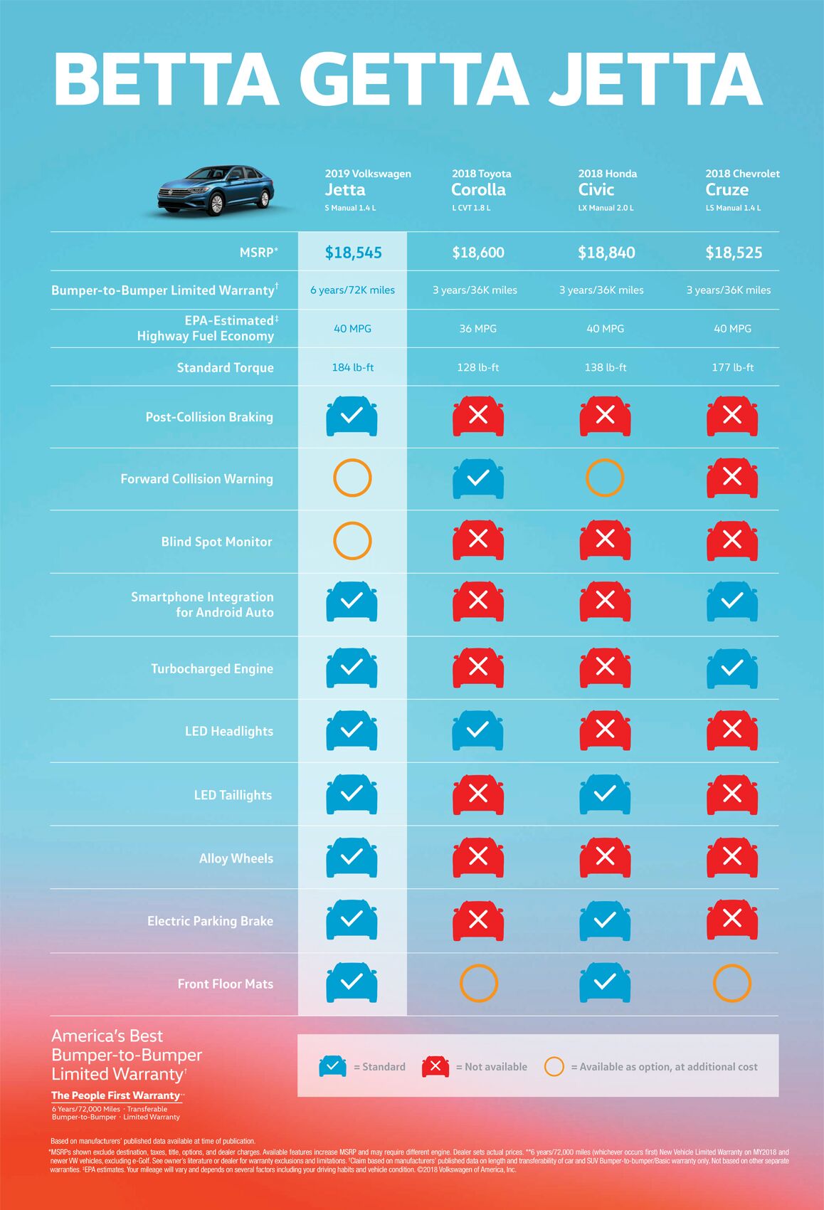 4 6 years/72,000 miles (whichever occurs first) New Vehicle Limited Warranty on MY2018 and newer VW vehicles, excluding e-Golf. See owner’s literature or dealer for warranty exclusions and limitations.